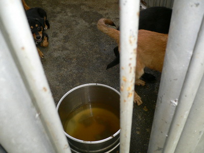 犬舍隔間不大,每間為小長方形,關兩隻中型犬就很擠了,再擺上大水盆及飼料盆,犬隻幾乎沒有活動空間(見圖一)。屋頂架有電風扇,但司機說:犬舍不會熱,不用開風扇。當日所見,犬舍內關有大山豬,洛威娜犬,拉不拉多,哈士奇,狼犬,幾隻混種成犬及幼犬,米格魯幼犬,西施及兔子。其中西施狗全身毛打結,還有皮膚病,且生殖器紅腫,健康狀況非常糟(見圖二)。此外,許多狗狗飲水的盆子內,盡是糞尿污水!(見圖三)