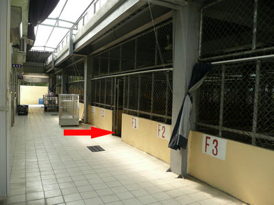 圖一:收容區外觀。民眾要進入需先在左邊的辦公室登記,再從中間的走道(紅色箭頭處)進入收容區。