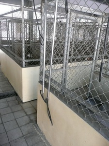 圖六:犬舍門口面向走道為鐵絲網門,其餘三面上面是鐵絲網、下面是水泥牆面。