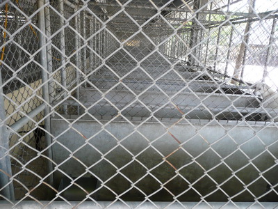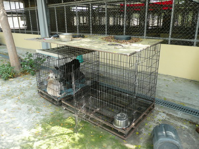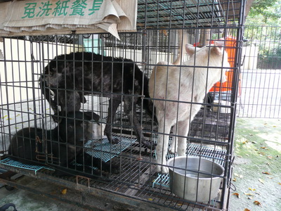 圖十二:犬舍外的組合式鐵籠,較小的一個關著三隻狗,工作人員說是為了隔離。