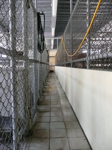 ◎第二次在平日前往訪查,看到收容所分成二大區,一區是辦公室及冷凍室、工具區,另一區是收容區。訪客必須先到辦公室登記,再由工作人員打開收容區的門進入參觀。收容區長約20-30公尺、寬20公尺,四週牆面是開放式,可直接看到收容區內部(見圖一~圖三),從辦公室進入收容區時會直接看到一個走道,走道的左右兩邊各有三排犬舍,共分成六區,每區都由一個個相連的落地欄舍組成。(見圖四、圖五)