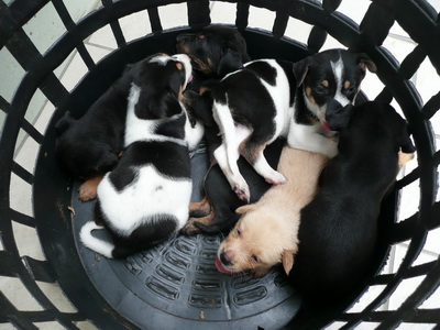 ◎另外收容區外面有個圓形塑膠籃子,裡面放有6隻幼犬,以及一個紙箱裝了2隻幼犬,都是民眾剛帶來棄養的(見圖十、十一)。
