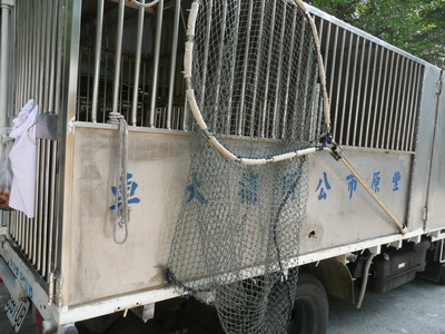 ◎隨後豐原市的捕犬人員送狗來,捕犬車車身為下半部封住,上半部為鐵欄杆,二側有門,後面也有門。當天籠內只有一隻狗,捕犬人員卸狗的方式是用捕犬桿套住狗頸,將狗直接從車上拉下來;收容所人員在旁拿著登記本(登記捕獲地點、毛色等),手拿掃瞄器,發現沒有植入晶片,捕犬人員就直接將狗拖入犬舍內。捕犬車旁還掛著一支大型捕犬網,看起來很新,車後門上掛著一包生肉,應是做為誘捕之用途!(見圖十六~十八)
