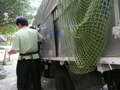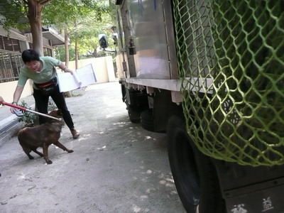 圖十六:豐原市公所捕犬車將捕獲犬隻送到后里收容所。車旁掛著一支大大的捕犬網。