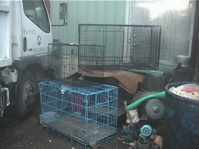 圖一:停車場的角落擺放幾個狗籠,即是流浪犬留置處。旁邊是廚餘桶。